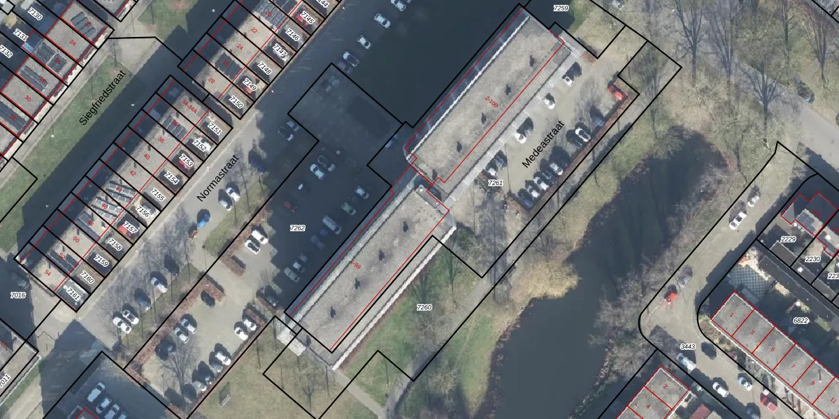 Het perceel waarop Normastraat 51 staat heeft een oppervlakte van 2682 m². Dit is een zeer groot perceel. De perceeloppervlakte wordt geregistreerd door het Kadaster. Gedetailleerde informatie over de maten van dit perceel kunt u vinden in het rapport Kadastrale kaart met maatvoering van Normastraat 51.
