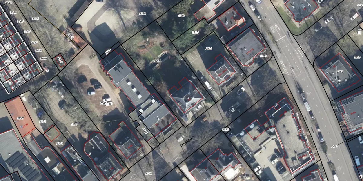 Het perceel waarop Paslaan 13 staat heeft een oppervlakte van 1295 m². Dit is een zeer groot perceel. De perceeloppervlakte wordt geregistreerd door het Kadaster. Gedetailleerde informatie over de maten van dit perceel kunt u vinden in het rapport Kadastrale kaart met maatvoering van Paslaan 13.