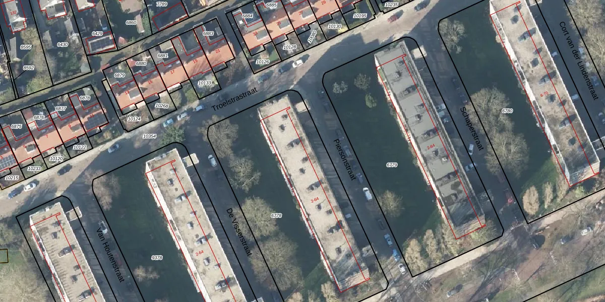 Het perceel waarop Piersonstraat 2-G1 staat heeft een oppervlakte van 2487 m². Dit is een zeer groot perceel. De perceeloppervlakte wordt geregistreerd door het Kadaster. Gedetailleerde informatie over de maten van dit perceel kunt u vinden in het rapport Kadastrale kaart met maatvoering van Piersonstraat 2-G1.