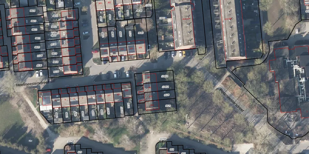Postmeestersdreef 201 is gelegen op kadastraal perceel APD02AC10453. Deze kadastrale aanduiding is uniek en wordt gebruikt door het Kadaster om eigendomsrechten en andere zakelijke rechten vast te leggen. Het perceel maakt onderdeel uit van de kadastrale gemeente Apeldoorn.