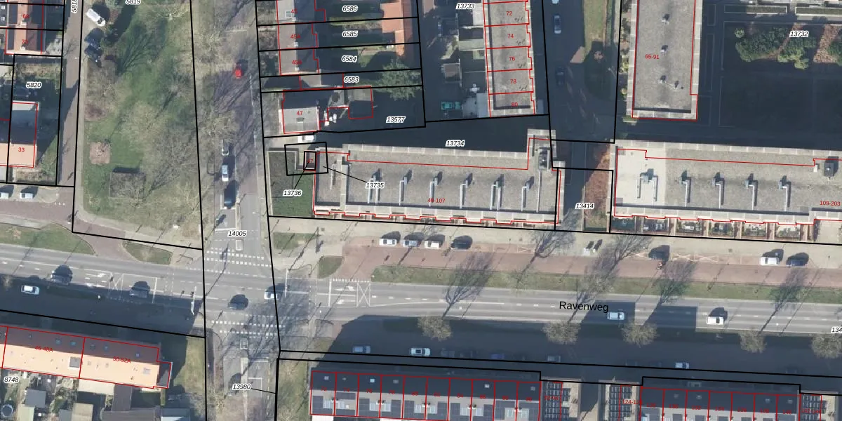Ravenweg 55 is gelegen op kadastraal perceel APD01L13734. Deze kadastrale aanduiding is uniek en wordt gebruikt door het Kadaster om eigendomsrechten en andere zakelijke rechten vast te leggen. Het perceel maakt onderdeel uit van de kadastrale gemeente Apeldoorn.