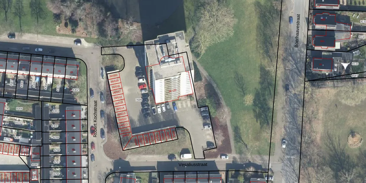 Het perceel waarop Robert Kochstraat 104 staat heeft een oppervlakte van 2465 m². Dit is een zeer groot perceel. De perceeloppervlakte wordt geregistreerd door het Kadaster. Gedetailleerde informatie over de maten van dit perceel kunt u vinden in het rapport Kadastrale kaart met maatvoering van Robert Kochstraat 104.
