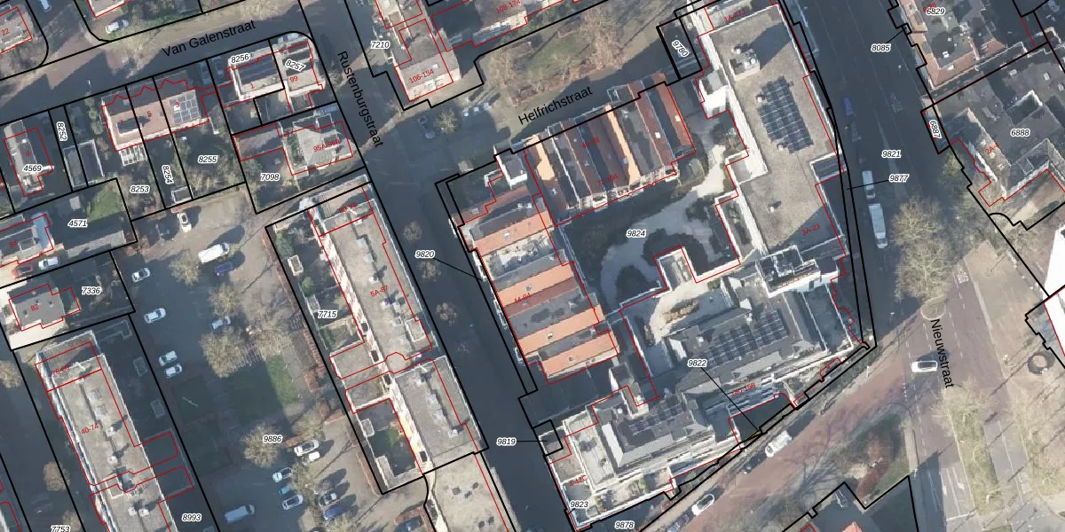 Het perceel waarop Rustenburgstraat 66 staat heeft een oppervlakte van 4719 m². Dit is een zeer groot perceel. De perceeloppervlakte wordt geregistreerd door het Kadaster. Gedetailleerde informatie over de maten van dit perceel kunt u vinden in het rapport Kadastrale kaart met maatvoering van Rustenburgstraat 66.