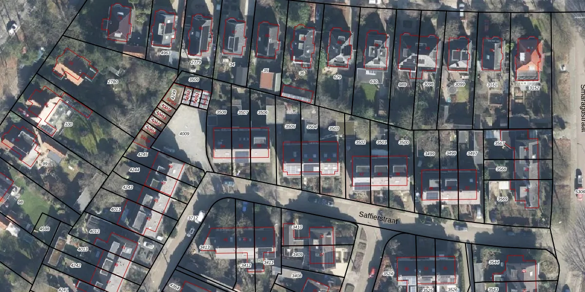 Saffierstraat 48 is gelegen op kadastraal perceel SRN00R3505. Deze kadastrale aanduiding is uniek en wordt gebruikt door het Kadaster om eigendomsrechten en andere zakelijke rechten vast te leggen. Het perceel maakt onderdeel uit van de kadastrale gemeente Hoog Soeren.