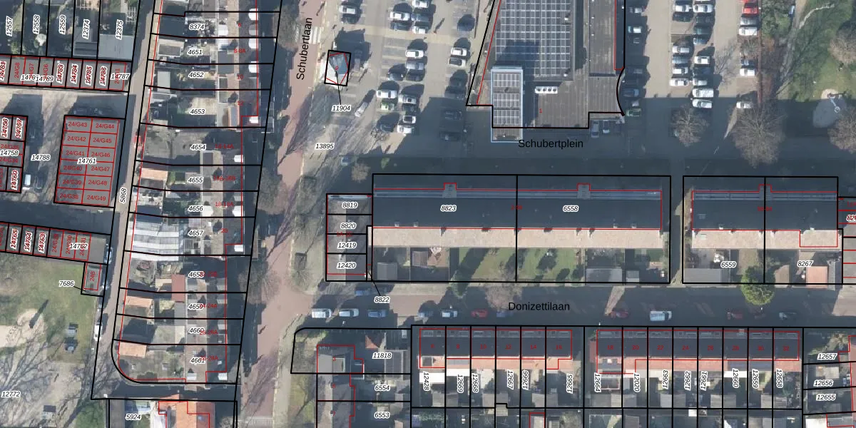 Het perceel waarop Schubertplein 12 staat heeft een oppervlakte van 845 m². Dit is een groot perceel. De perceeloppervlakte wordt geregistreerd door het Kadaster. Gedetailleerde informatie over de maten van dit perceel kunt u vinden in het rapport Kadastrale kaart met maatvoering van Schubertplein 12.
