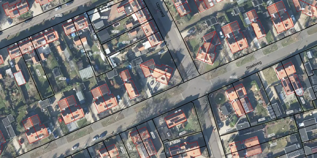 Het perceel waarop Staalweg 42 staat heeft een oppervlakte van 7313 m². Dit is een zeer groot perceel. De perceeloppervlakte wordt geregistreerd door het Kadaster. Gedetailleerde informatie over de maten van dit perceel kunt u vinden in het rapport Kadastrale kaart met maatvoering van Staalweg 42.