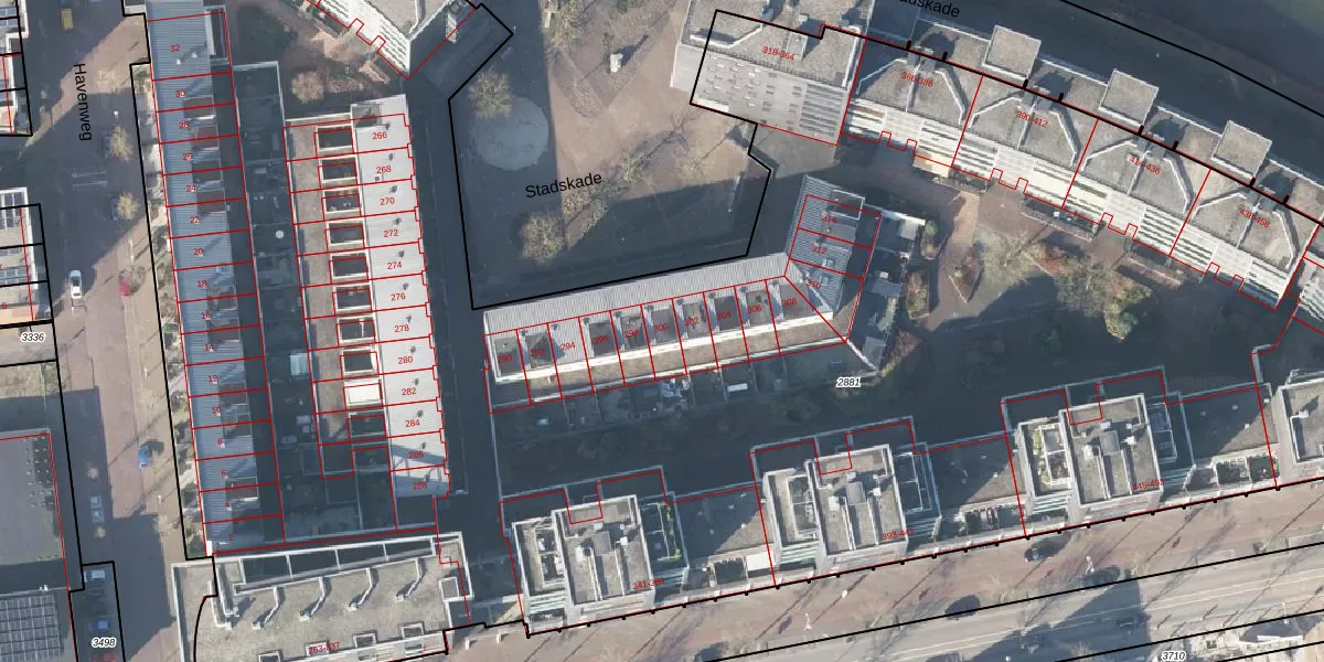 Het perceel waarop Stadskade 300 staat heeft een oppervlakte van 1,4 ha. Dit is een zeer groot perceel. De perceeloppervlakte wordt geregistreerd door het Kadaster. Gedetailleerde informatie over de maten van dit perceel kunt u vinden in het rapport Kadastrale kaart met maatvoering van Stadskade 300.