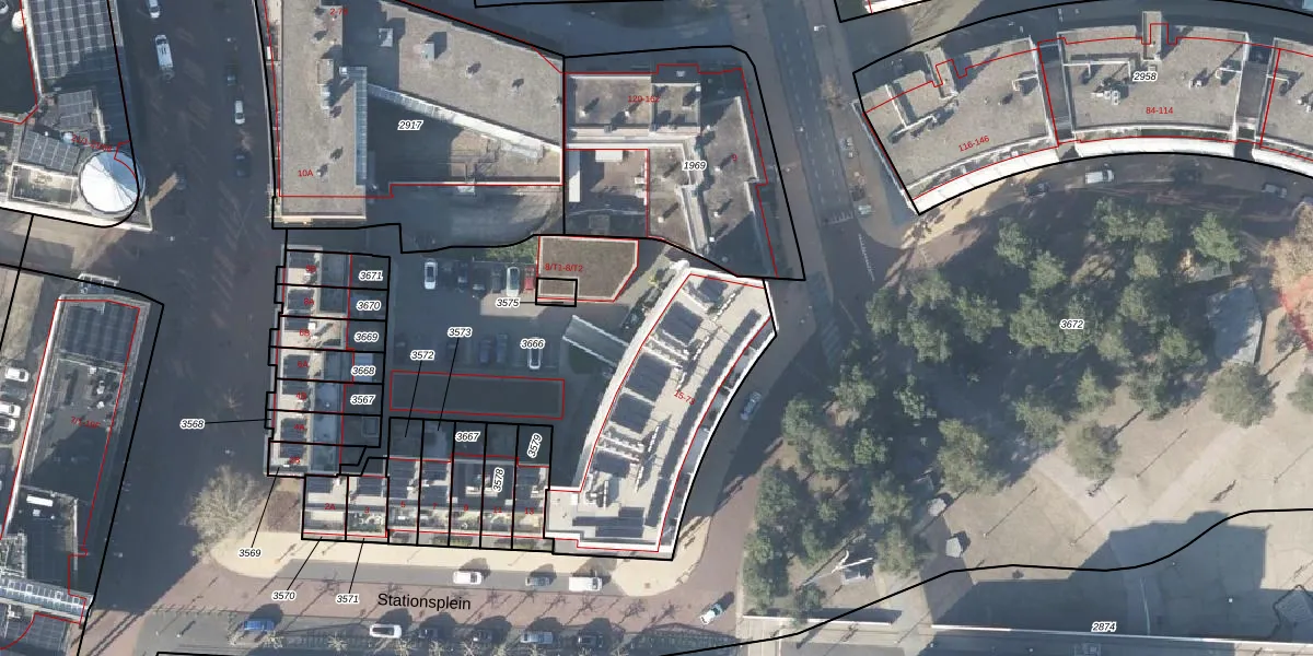 Het perceel waarop Stationsplein 23 staat heeft een oppervlakte van 2008 m². Dit is een zeer groot perceel. De perceeloppervlakte wordt geregistreerd door het Kadaster. Gedetailleerde informatie over de maten van dit perceel kunt u vinden in het rapport Kadastrale kaart met maatvoering van Stationsplein 23.
