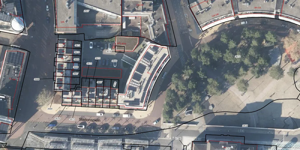Het perceel waarop Stationsplein 69 staat heeft een oppervlakte van 2008 m². Dit is een zeer groot perceel. De perceeloppervlakte wordt geregistreerd door het Kadaster. Gedetailleerde informatie over de maten van dit perceel kunt u vinden in het rapport Kadastrale kaart met maatvoering van Stationsplein 69.