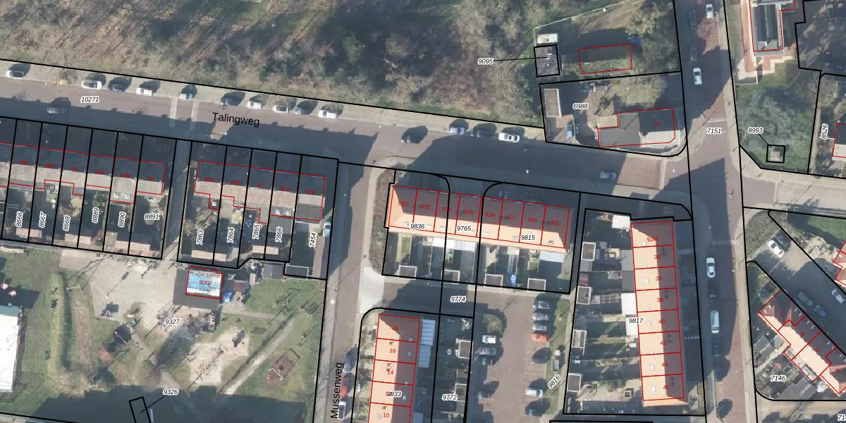 Talingweg 92-E is gelegen op kadastraal perceel APD01N9836. Deze kadastrale aanduiding is uniek en wordt gebruikt door het Kadaster om eigendomsrechten en andere zakelijke rechten vast te leggen. Het perceel maakt onderdeel uit van de kadastrale gemeente Apeldoorn.