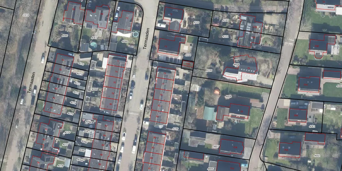 Termaaden 77 is gelegen op kadastraal perceel APD01AB4106. Deze kadastrale aanduiding is uniek en wordt gebruikt door het Kadaster om eigendomsrechten en andere zakelijke rechten vast te leggen. Het perceel maakt onderdeel uit van de kadastrale gemeente Apeldoorn.