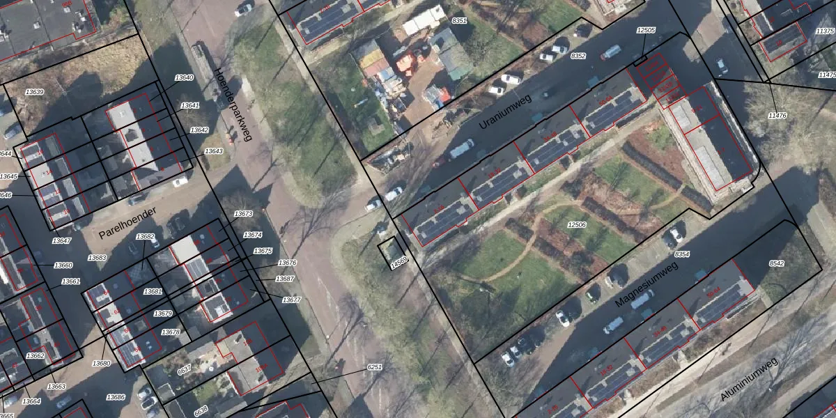 Het perceel waarop Uraniumweg 2 staat heeft een oppervlakte van 3230 m². Dit is een zeer groot perceel. De perceeloppervlakte wordt geregistreerd door het Kadaster. Gedetailleerde informatie over de maten van dit perceel kunt u vinden in het rapport Kadastrale kaart met maatvoering van Uraniumweg 2.