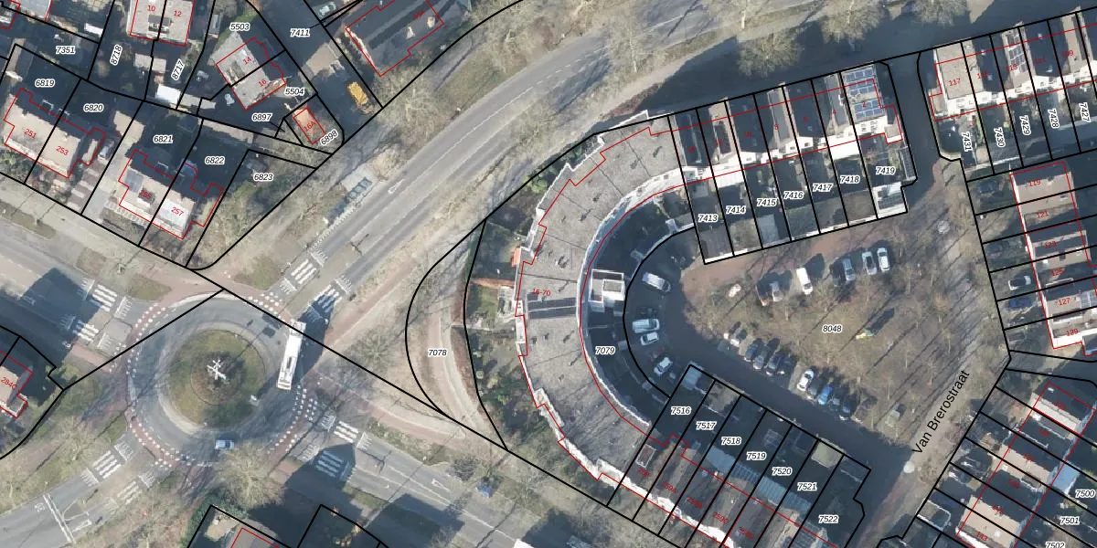 Het perceel waarop Van Brerostraat 50 staat heeft een oppervlakte van 1865 m². Dit is een zeer groot perceel. De perceeloppervlakte wordt geregistreerd door het Kadaster. Gedetailleerde informatie over de maten van dit perceel kunt u vinden in het rapport Kadastrale kaart met maatvoering van Van Brerostraat 50.