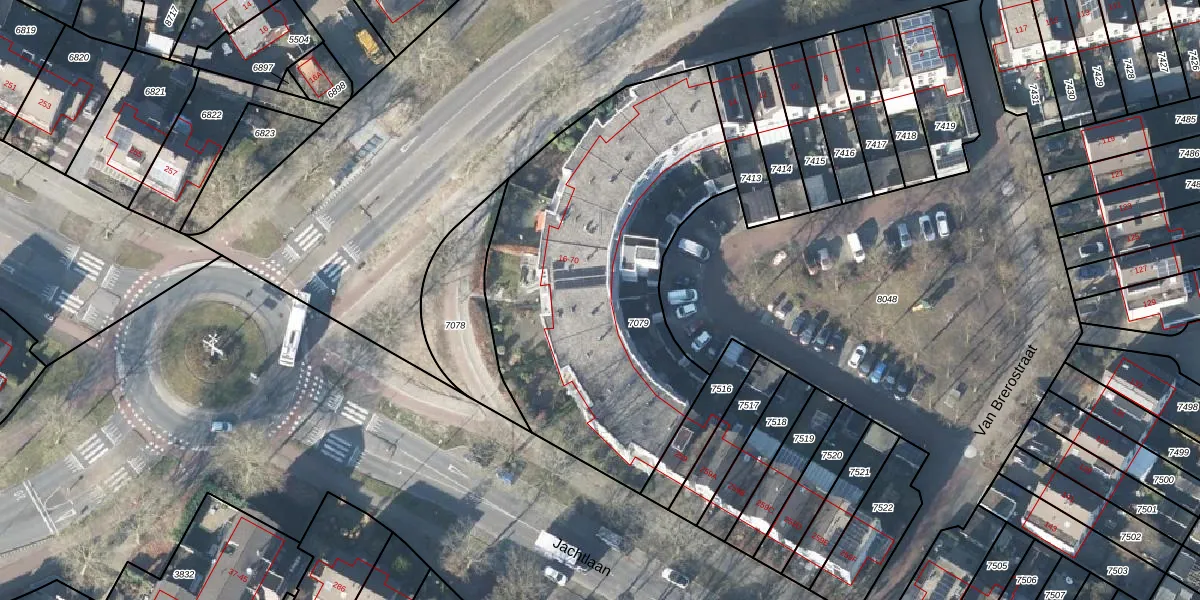 Het perceel waarop Van Brerostraat 66 staat heeft een oppervlakte van 1865 m². Dit is een zeer groot perceel. De perceeloppervlakte wordt geregistreerd door het Kadaster. Gedetailleerde informatie over de maten van dit perceel kunt u vinden in het rapport Kadastrale kaart met maatvoering van Van Brerostraat 66.