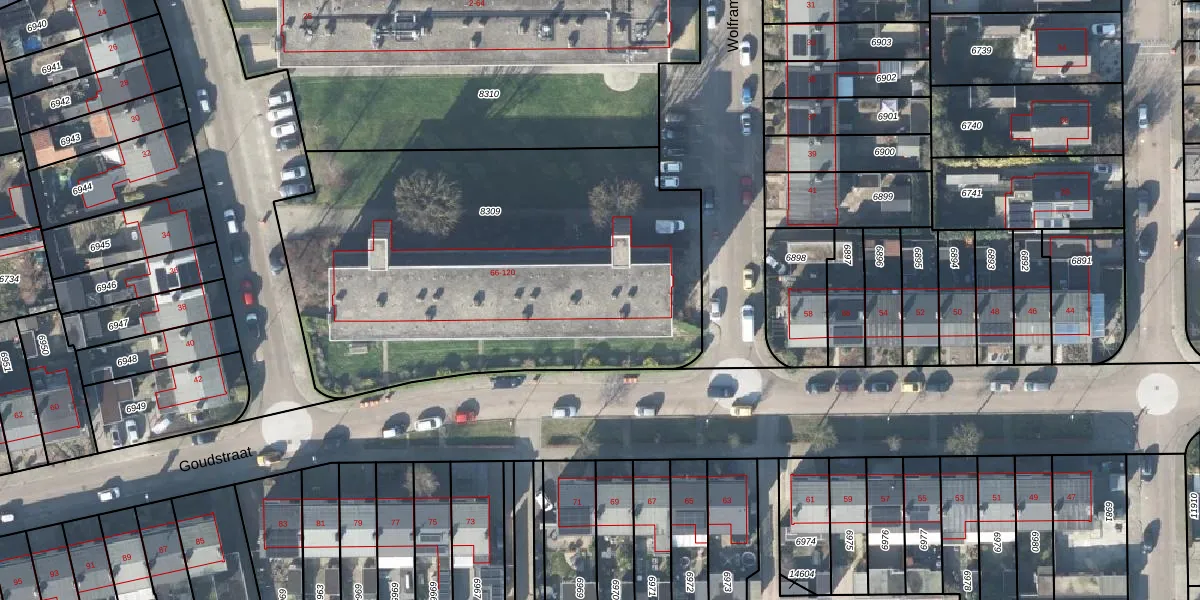 Het perceel waarop Wolframstraat 110 staat heeft een oppervlakte van 2535 m². Dit is een zeer groot perceel. De perceeloppervlakte wordt geregistreerd door het Kadaster. Gedetailleerde informatie over de maten van dit perceel kunt u vinden in het rapport Kadastrale kaart met maatvoering van Wolframstraat 110.