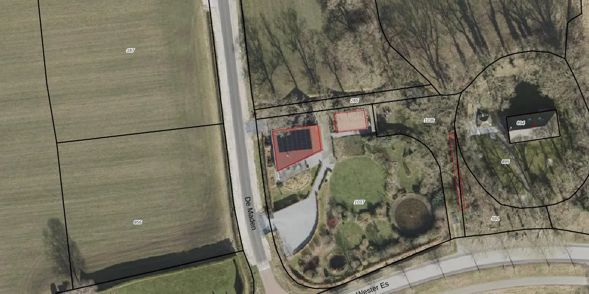 Het perceel waarop De Maden 8 staat heeft een oppervlakte van 3040 m². Dit is een zeer groot perceel. De perceeloppervlakte wordt geregistreerd door het Kadaster. Gedetailleerde informatie over de maten van dit perceel kunt u vinden in het rapport Kadastrale kaart met maatvoering van De Maden 8.
