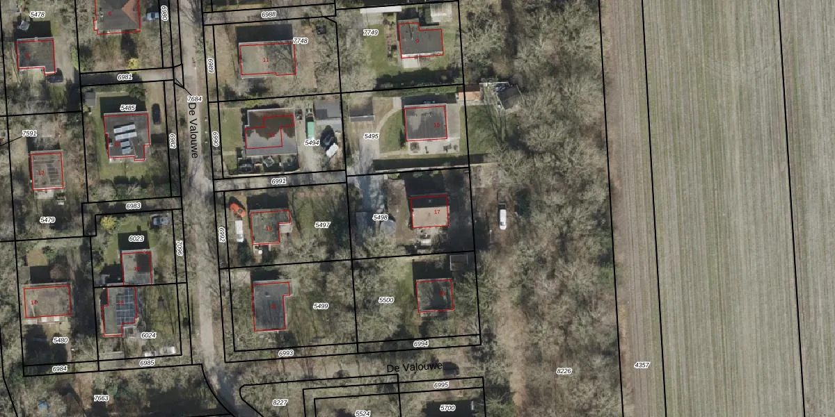 Het perceel waarop De Valouwe 17 staat heeft een oppervlakte van 592 m². Dit is een groot perceel. De perceeloppervlakte wordt geregistreerd door het Kadaster. Gedetailleerde informatie over de maten van dit perceel kunt u vinden in het rapport Kadastrale kaart met maatvoering van De Valouwe 17.