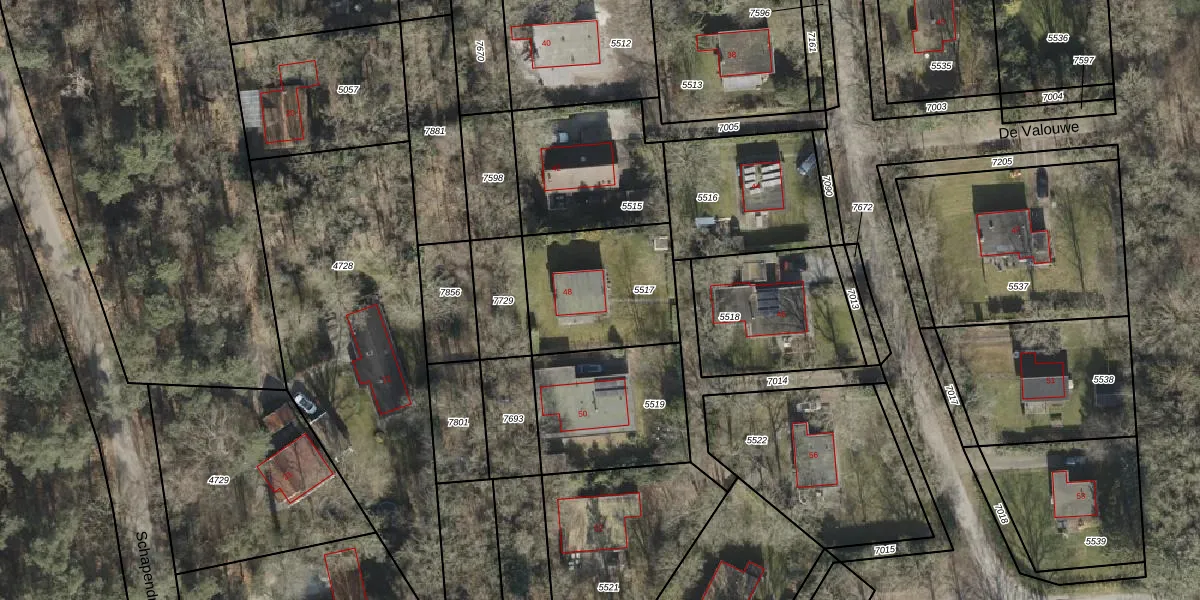 Het perceel waarop De Valouwe 48 staat heeft een oppervlakte van 499 m². Dit is een groot perceel. De perceeloppervlakte wordt geregistreerd door het Kadaster. Gedetailleerde informatie over de maten van dit perceel kunt u vinden in het rapport Kadastrale kaart met maatvoering van De Valouwe 48.