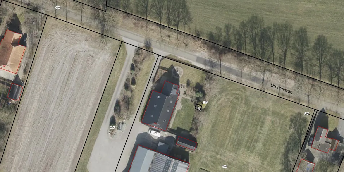 Het perceel waarop Drentseweg 34 staat heeft een oppervlakte van 1,2 ha. Dit is een zeer groot perceel. De perceeloppervlakte wordt geregistreerd door het Kadaster. Gedetailleerde informatie over de maten van dit perceel kunt u vinden in het rapport Kadastrale kaart met maatvoering van Drentseweg 34.