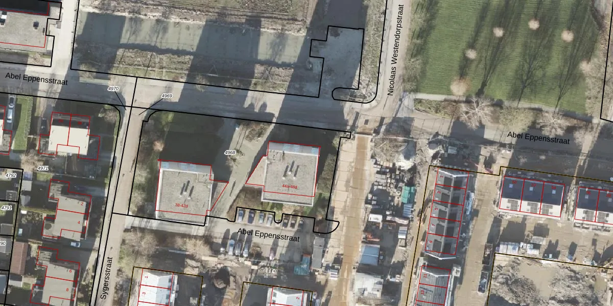 Het perceel waarop Abel Eppensstraat 48-a staat heeft een oppervlakte van 2120 m². Dit is een zeer groot perceel. De perceeloppervlakte wordt geregistreerd door het Kadaster. Gedetailleerde informatie over de maten van dit perceel kunt u vinden in het rapport Kadastrale kaart met maatvoering van Abel Eppensstraat 48-a.