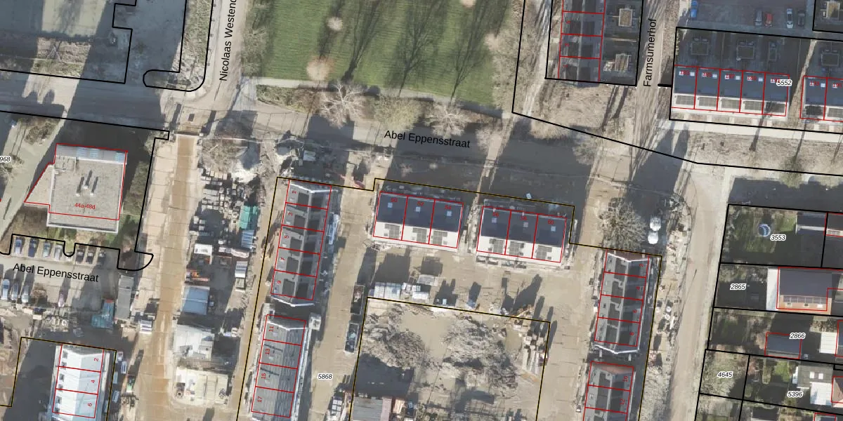 Het perceel waarop Abel Eppensstraat 52 staat heeft een oppervlakte van 6428 m². Dit is een zeer groot perceel. De perceeloppervlakte wordt geregistreerd door het Kadaster. Gedetailleerde informatie over de maten van dit perceel kunt u vinden in het rapport Kadastrale kaart met maatvoering van Abel Eppensstraat 52.