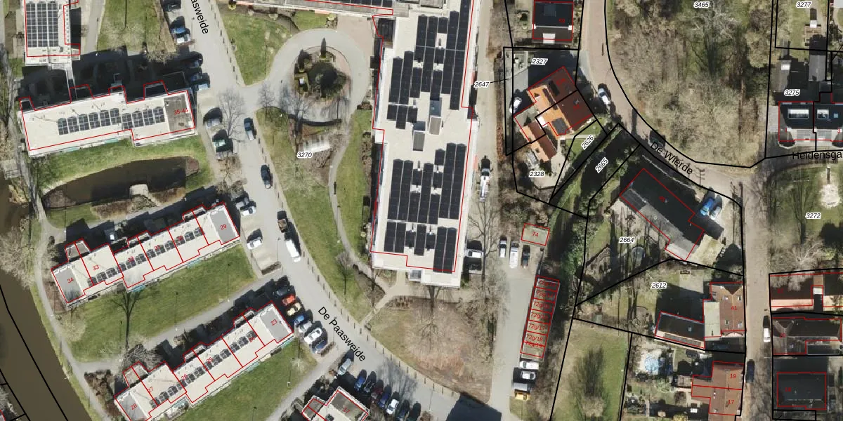 Het perceel waarop De Paasweide 72-113 staat heeft een oppervlakte van 3,1 ha. Dit is een zeer groot perceel. De perceeloppervlakte wordt geregistreerd door het Kadaster. Gedetailleerde informatie over de maten van dit perceel kunt u vinden in het rapport Kadastrale kaart met maatvoering van De Paasweide 72-113.