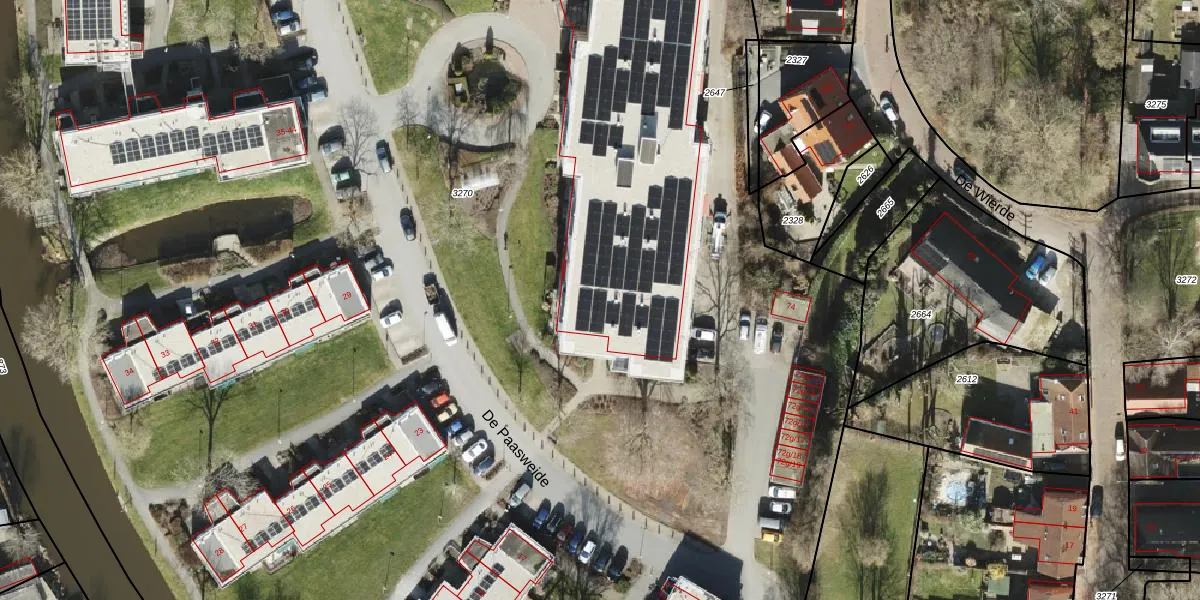 Het perceel waarop De Paasweide 72-121 staat heeft een oppervlakte van 3,1 ha. Dit is een zeer groot perceel. De perceeloppervlakte wordt geregistreerd door het Kadaster. Gedetailleerde informatie over de maten van dit perceel kunt u vinden in het rapport Kadastrale kaart met maatvoering van De Paasweide 72-121.