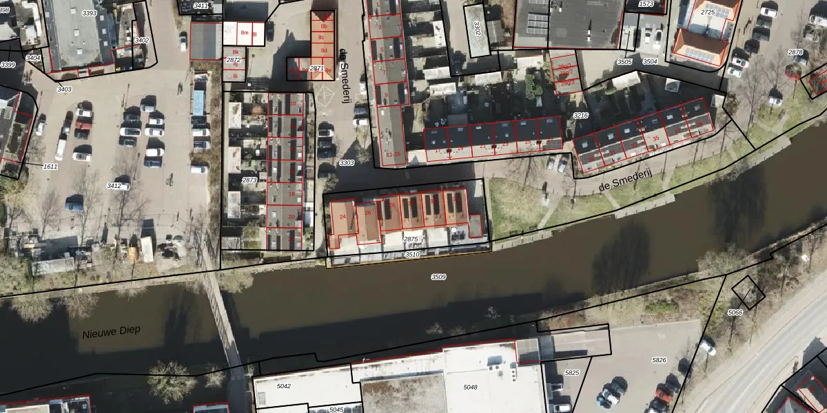 de Smederij 30 is gelegen op kadastraal perceel APG00D2875. Deze kadastrale aanduiding is uniek en wordt gebruikt door het Kadaster om eigendomsrechten en andere zakelijke rechten vast te leggen. Het perceel maakt onderdeel uit van de kadastrale gemeente Appingedam.