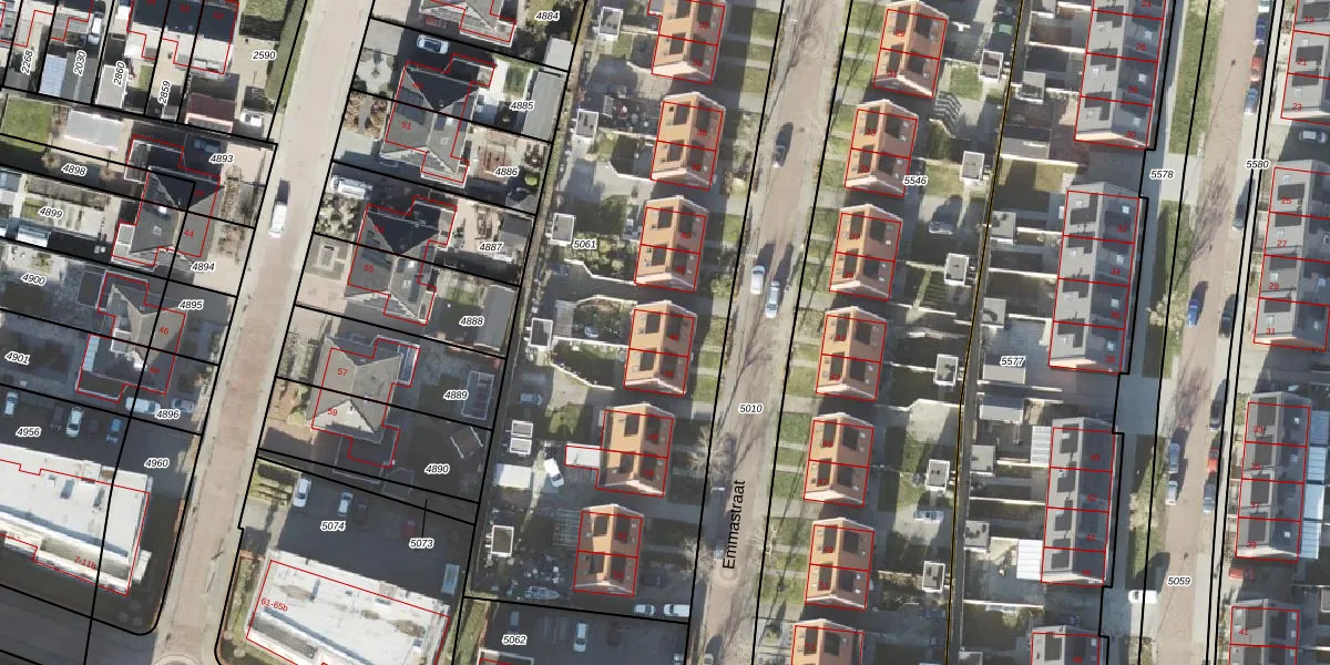 Het perceel waarop Emmastraat 44 staat heeft een oppervlakte van 5190 m². Dit is een zeer groot perceel. De perceeloppervlakte wordt geregistreerd door het Kadaster. Gedetailleerde informatie over de maten van dit perceel kunt u vinden in het rapport Kadastrale kaart met maatvoering van Emmastraat 44.