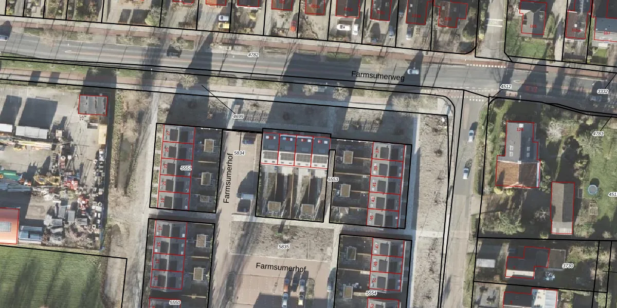 Het perceel waarop Farmsumerhof 33 staat heeft een oppervlakte van 1318 m². Dit is een zeer groot perceel. De perceeloppervlakte wordt geregistreerd door het Kadaster. Gedetailleerde informatie over de maten van dit perceel kunt u vinden in het rapport Kadastrale kaart met maatvoering van Farmsumerhof 33.