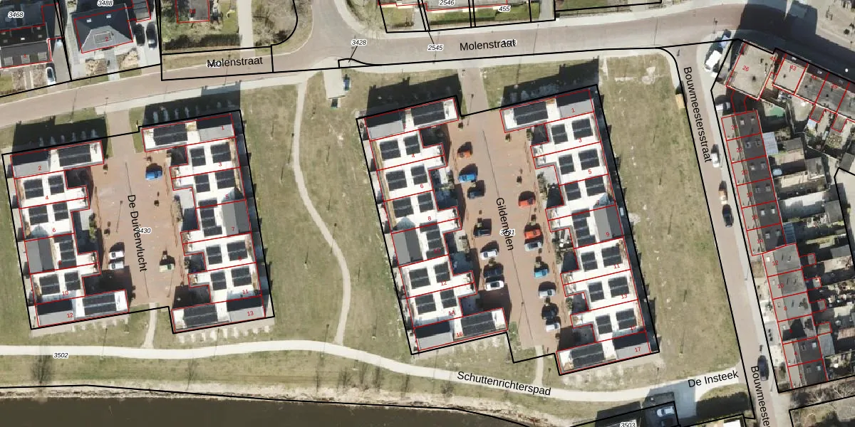 Het perceel waarop Gildemolen 8 staat heeft een oppervlakte van 3415 m². Dit is een zeer groot perceel. De perceeloppervlakte wordt geregistreerd door het Kadaster. Gedetailleerde informatie over de maten van dit perceel kunt u vinden in het rapport Kadastrale kaart met maatvoering van Gildemolen 8.