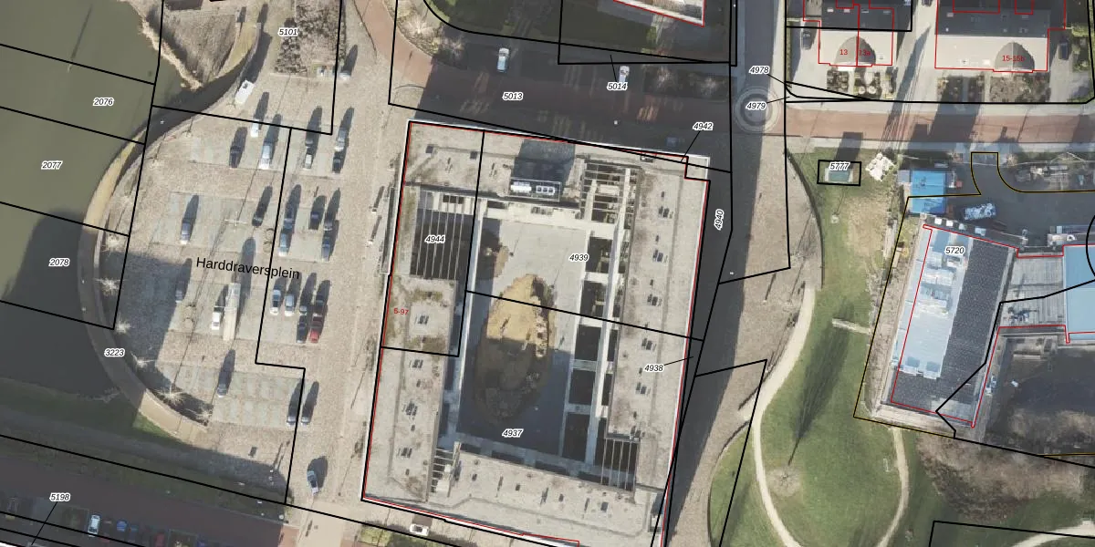 Het perceel waarop Harddraversplein 61 staat heeft een oppervlakte van 1281 m². Dit is een zeer groot perceel. De perceeloppervlakte wordt geregistreerd door het Kadaster. Gedetailleerde informatie over de maten van dit perceel kunt u vinden in het rapport Kadastrale kaart met maatvoering van Harddraversplein 61.