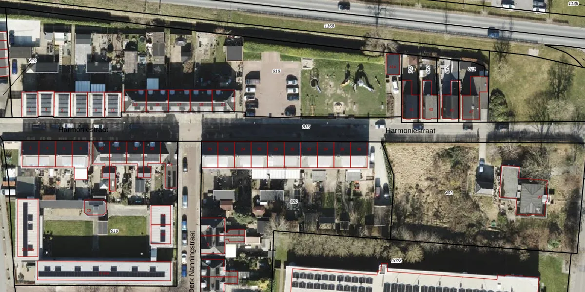 Het perceel waarop Harmoniestraat 30 staat heeft een oppervlakte van 2633 m². Dit is een zeer groot perceel. De perceeloppervlakte wordt geregistreerd door het Kadaster. Gedetailleerde informatie over de maten van dit perceel kunt u vinden in het rapport Kadastrale kaart met maatvoering van Harmoniestraat 30.