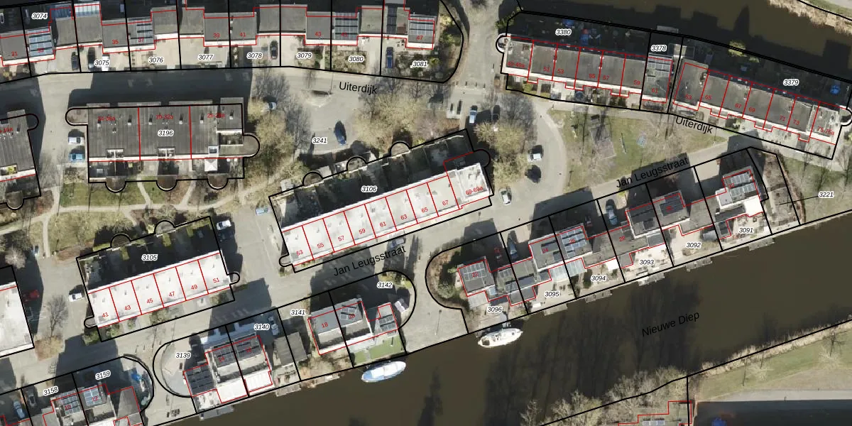 Het perceel waarop Jan Leugsstraat 65 staat heeft een oppervlakte van 968 m². Dit is een groot perceel. De perceeloppervlakte wordt geregistreerd door het Kadaster. Gedetailleerde informatie over de maten van dit perceel kunt u vinden in het rapport Kadastrale kaart met maatvoering van Jan Leugsstraat 65.