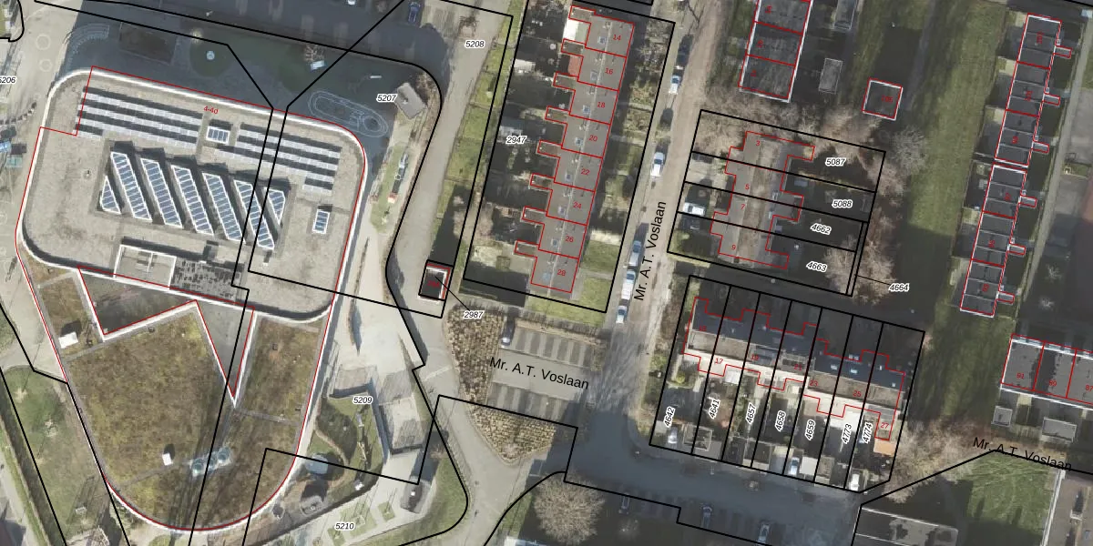 Mr. A.T. Voslaan 28 is gelegen op kadastraal perceel APG00G2947. Deze kadastrale aanduiding is uniek en wordt gebruikt door het Kadaster om eigendomsrechten en andere zakelijke rechten vast te leggen. Het perceel maakt onderdeel uit van de kadastrale gemeente Appingedam.