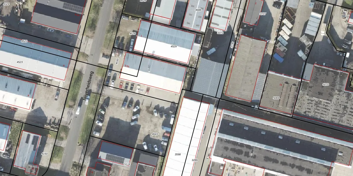 Het perceel waarop Nijverheidsweg 3-b staat heeft een oppervlakte van 804 m². Dit is een groot perceel. De perceeloppervlakte wordt geregistreerd door het Kadaster. Gedetailleerde informatie over de maten van dit perceel kunt u vinden in het rapport Kadastrale kaart met maatvoering van Nijverheidsweg 3-b.
