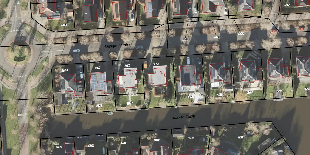 Olingermeeden 33 is gelegen op kadastraal perceel APG00H2199. Deze kadastrale aanduiding is uniek en wordt gebruikt door het Kadaster om eigendomsrechten en andere zakelijke rechten vast te leggen. Het perceel maakt onderdeel uit van de kadastrale gemeente Appingedam.
