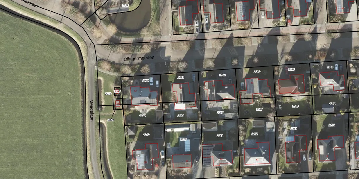 Olingermeeden 55 is gelegen op kadastraal perceel APG00H2082. Deze kadastrale aanduiding is uniek en wordt gebruikt door het Kadaster om eigendomsrechten en andere zakelijke rechten vast te leggen. Het perceel maakt onderdeel uit van de kadastrale gemeente Appingedam.