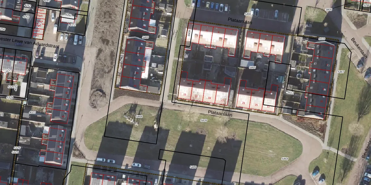 Plataanlaan 15 is gelegen op kadastraal perceel APG00G5465. Deze kadastrale aanduiding is uniek en wordt gebruikt door het Kadaster om eigendomsrechten en andere zakelijke rechten vast te leggen. Het perceel maakt onderdeel uit van de kadastrale gemeente Appingedam.