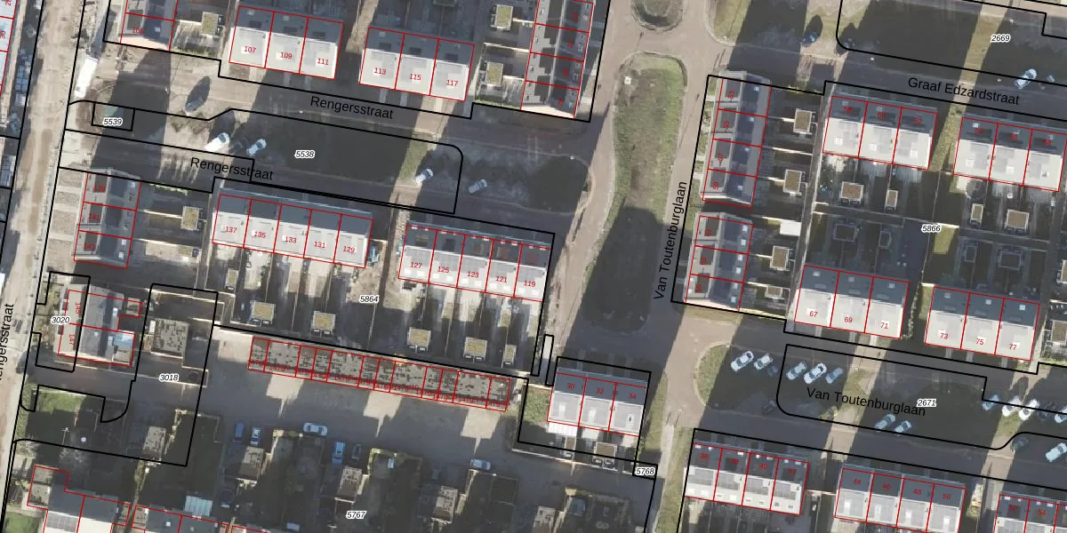 Het perceel waarop Rengersstraat 119 staat heeft een oppervlakte van 3018 m². Dit is een zeer groot perceel. De perceeloppervlakte wordt geregistreerd door het Kadaster. Gedetailleerde informatie over de maten van dit perceel kunt u vinden in het rapport Kadastrale kaart met maatvoering van Rengersstraat 119.