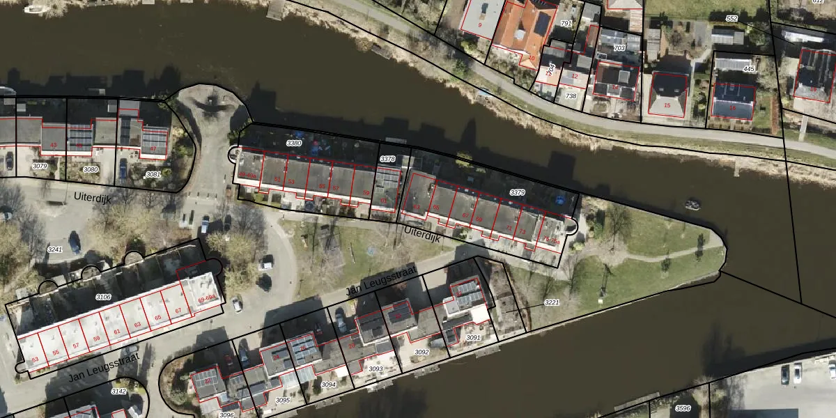 Uiterdijk 63 is gelegen op kadastraal perceel APG00D3379. Deze kadastrale aanduiding is uniek en wordt gebruikt door het Kadaster om eigendomsrechten en andere zakelijke rechten vast te leggen. Het perceel maakt onderdeel uit van de kadastrale gemeente Appingedam.