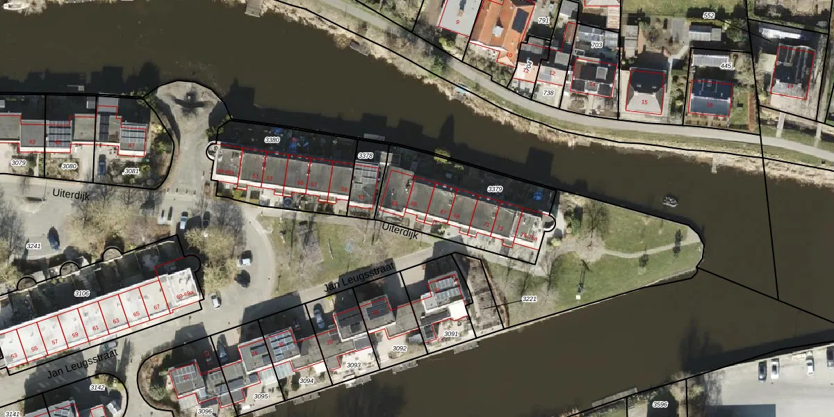 Uiterdijk 65 is gelegen op kadastraal perceel APG00D3379. Deze kadastrale aanduiding is uniek en wordt gebruikt door het Kadaster om eigendomsrechten en andere zakelijke rechten vast te leggen. Het perceel maakt onderdeel uit van de kadastrale gemeente Appingedam.