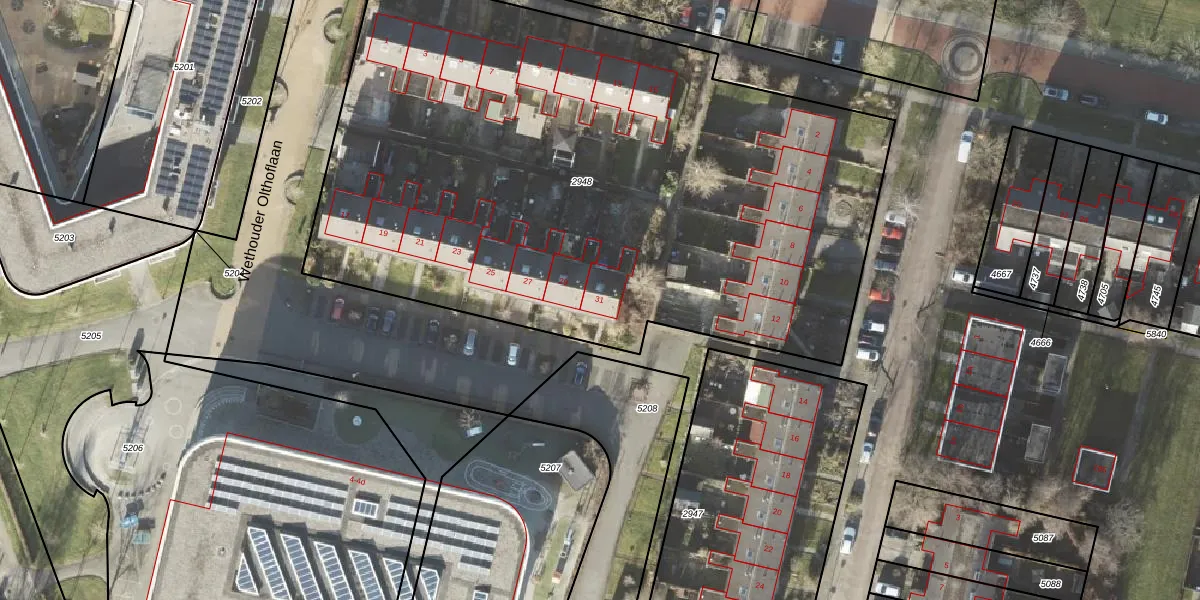 Het perceel waarop Wethouder Olthoflaan 31 staat heeft een oppervlakte van 4360 m². Dit is een zeer groot perceel. De perceeloppervlakte wordt geregistreerd door het Kadaster. Gedetailleerde informatie over de maten van dit perceel kunt u vinden in het rapport Kadastrale kaart met maatvoering van Wethouder Olthoflaan 31.