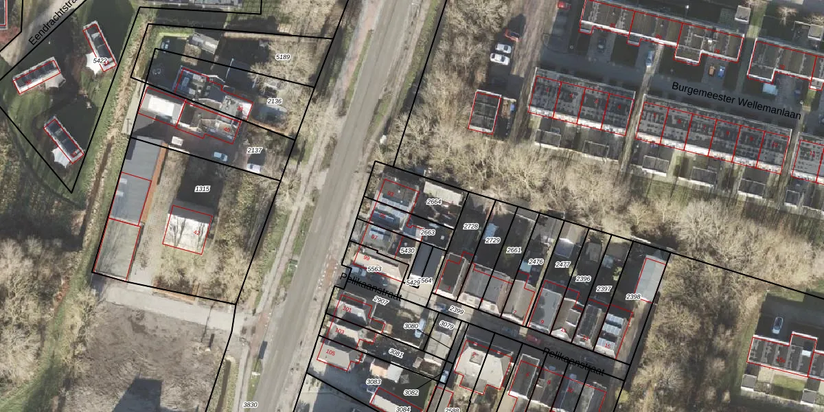 Gebruik de zoekbalk of klik op een perceel voor informatie over de adressen binnen dit perceel.