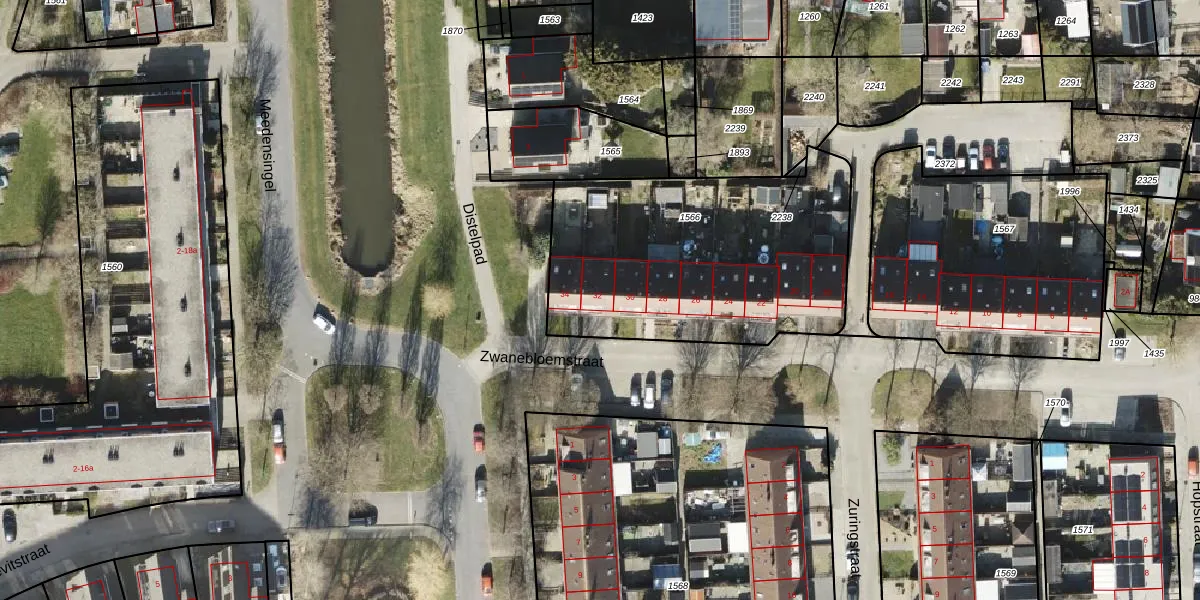 Het perceel waarop Zwanebloemstraat 32 staat heeft een oppervlakte van 1357 m². Dit is een zeer groot perceel. De perceeloppervlakte wordt geregistreerd door het Kadaster. Gedetailleerde informatie over de maten van dit perceel kunt u vinden in het rapport Kadastrale kaart met maatvoering van Zwanebloemstraat 32.
