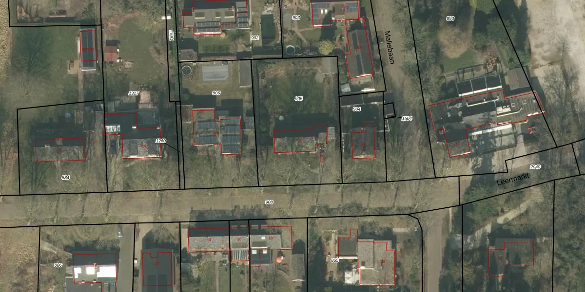 Het perceel waarop Leermarkt 15 staat heeft een oppervlakte van 1280 m². Dit is een zeer groot perceel. De perceeloppervlakte wordt geregistreerd door het Kadaster. Gedetailleerde informatie over de maten van dit perceel kunt u vinden in het rapport Kadastrale kaart met maatvoering van Leermarkt 15.