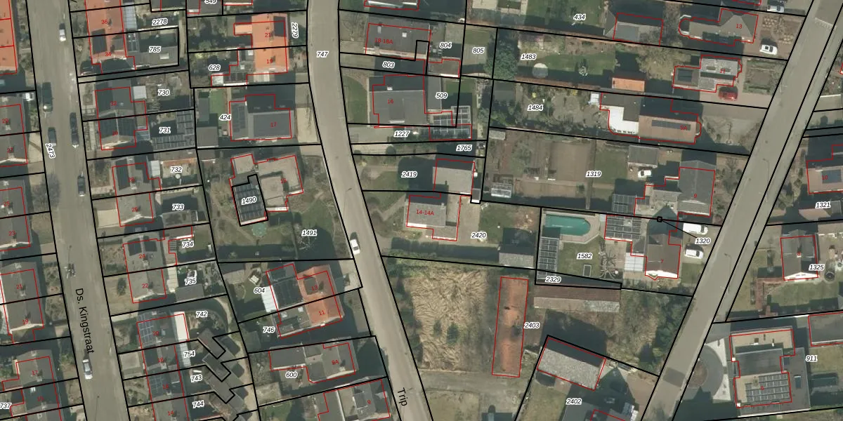 Het perceel waarop Trip 14 staat heeft een oppervlakte van 620 m². Dit is een groot perceel. De perceeloppervlakte wordt geregistreerd door het Kadaster. Gedetailleerde informatie over de maten van dit perceel kunt u vinden in het rapport Kadastrale kaart met maatvoering van Trip 14.
