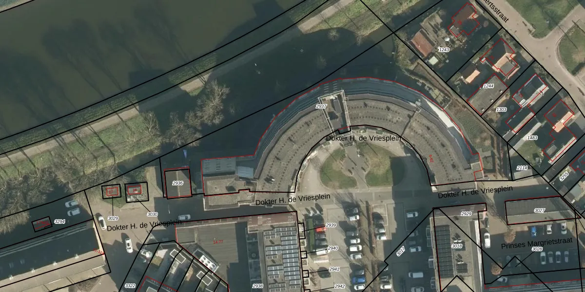 Het perceel waarop Dokter H. de Vriesplein 28 staat heeft een oppervlakte van 2950 m². Dit is een zeer groot perceel. De perceeloppervlakte wordt geregistreerd door het Kadaster. Gedetailleerde informatie over de maten van dit perceel kunt u vinden in het rapport Kadastrale kaart met maatvoering van Dokter H. de Vriesplein 28.