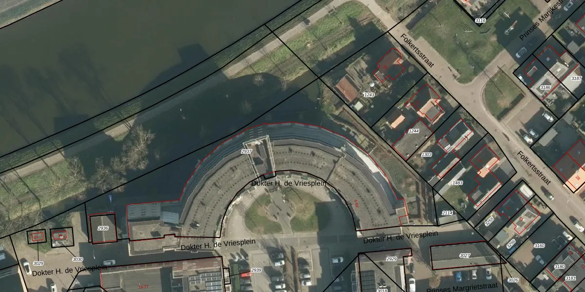 Het perceel waarop Dokter H. de Vriesplein 38 staat heeft een oppervlakte van 2950 m². Dit is een zeer groot perceel. De perceeloppervlakte wordt geregistreerd door het Kadaster. Gedetailleerde informatie over de maten van dit perceel kunt u vinden in het rapport Kadastrale kaart met maatvoering van Dokter H. de Vriesplein 38.