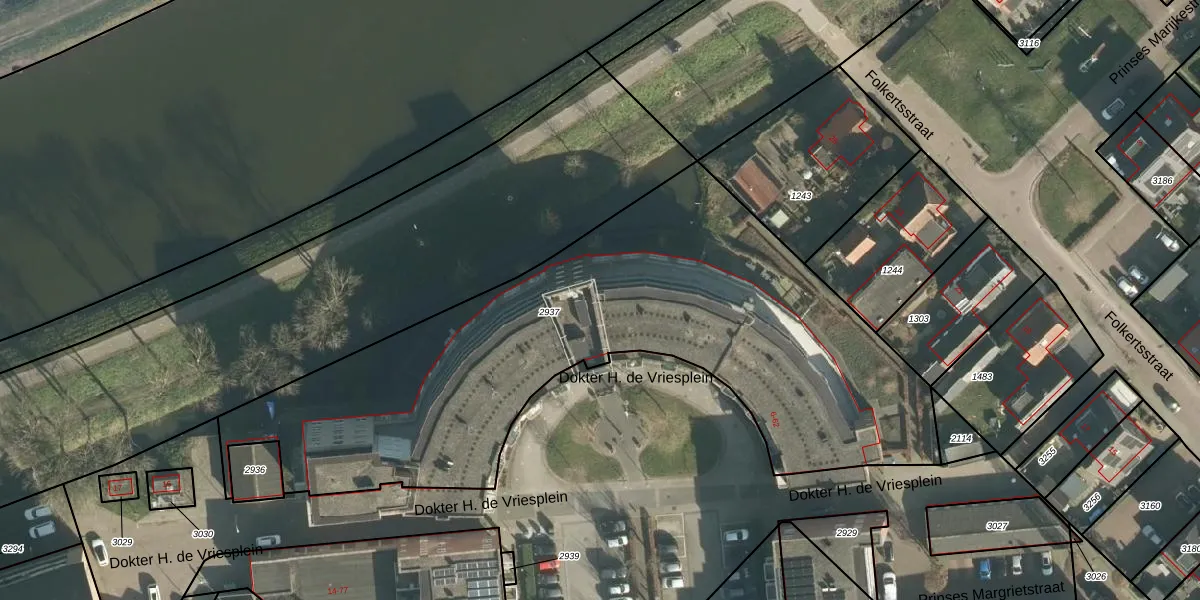 Het perceel waarop Dokter H. de Vriesplein 39 staat heeft een oppervlakte van 2950 m². Dit is een zeer groot perceel. De perceeloppervlakte wordt geregistreerd door het Kadaster. Gedetailleerde informatie over de maten van dit perceel kunt u vinden in het rapport Kadastrale kaart met maatvoering van Dokter H. de Vriesplein 39.